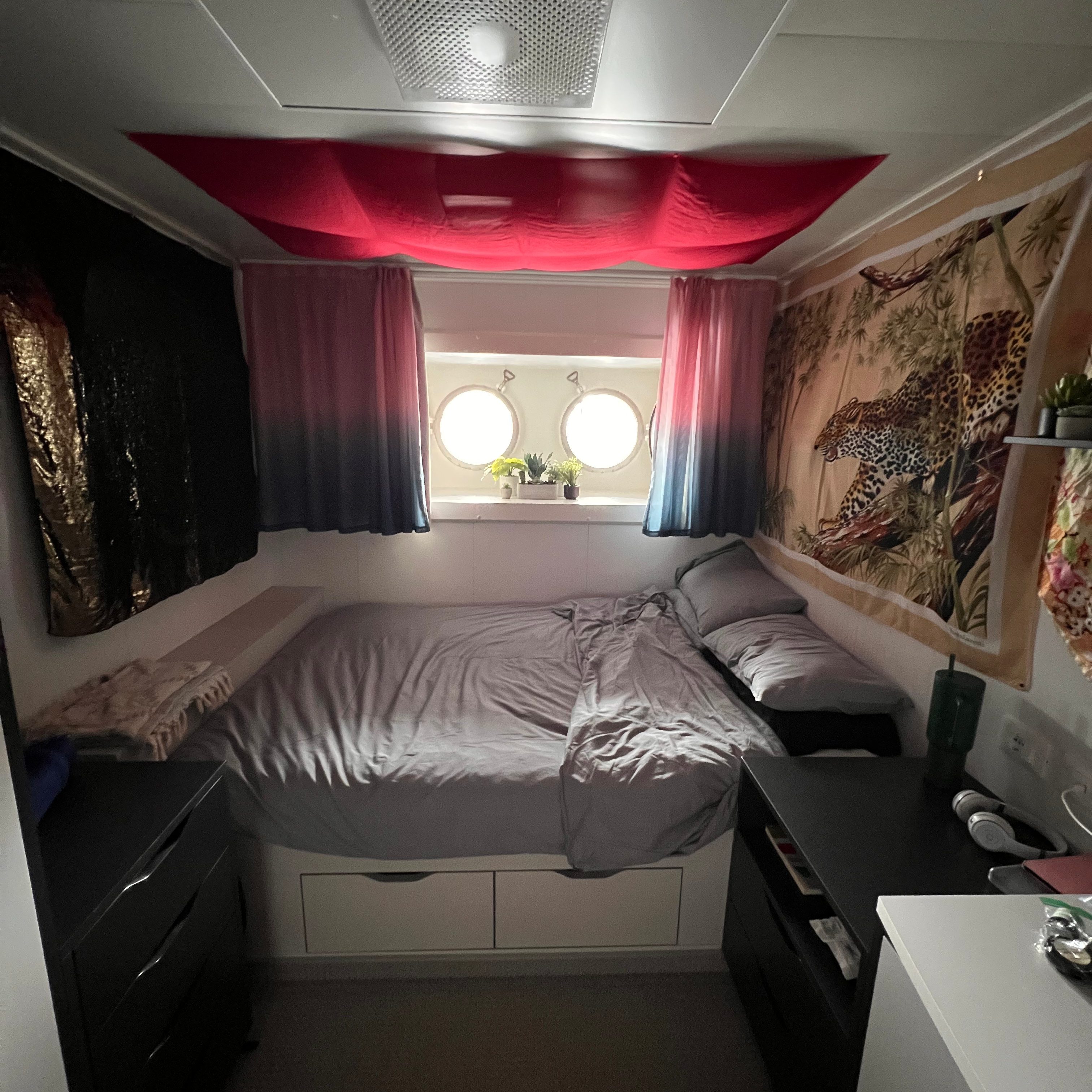 Amidst all this, my cabin is my sanctuary. I decorate it the second I get inside. For me decorating means using magnets to cover all of the hospitalesque white walls with huge colorful scarves creating a kind of bohemian wall paper. I have a large room (relatively speaking), a full sized bed, two portholes, closets, a desk and my very own bathroom. This sounds luxurious (and for ship life, it really is) but don’t get it twisted, we’re talking about a room that the Kardashians would consider the size of a very small walk in closet.